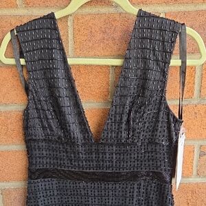 Gorgeous Mac Duggal Beaded Double V Neck Gown. Features a slit at center back, allover grid-patterned beading and banded waist. Fully lined. Made in India.
