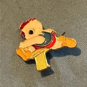 Set of vintage Chinese Chicken Olympics pins. Features colorful designs with red, yellow, and white accents.