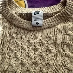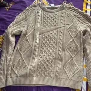 Cozy cable knit sweater by Nike. Features intricate knit design. Ideal for casual wear.