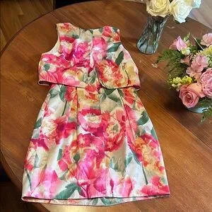 This sophisticated Eliza J dress showcases a vibrant pink and orange color scheme, ideal for cocktail events. The sleeveless design features a bateau neckline and a charming peter pan collar, adding a touch of elegance. Perfect for formal occasions, this dress combines style and comfort seamlessly.