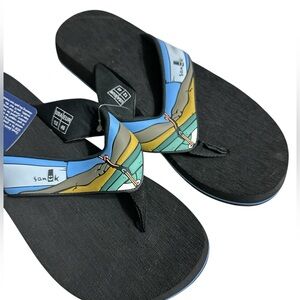 Stylish Sanuk flip flops with black soles and vibrant, multicolored straps. Ideal for everyday comfort, with a surfer design V strap. New with original tags.