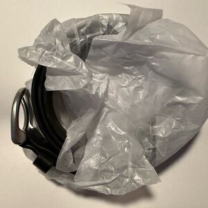 Sleek black leather belt featuring a silver buckle. Perfect for any outfit. NWT
