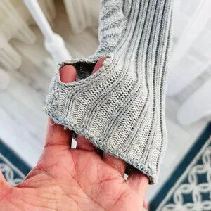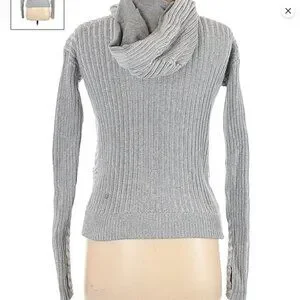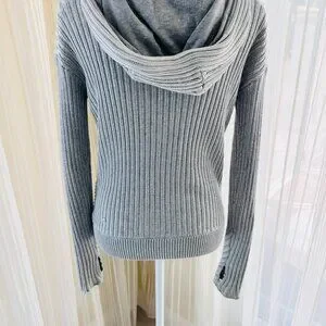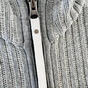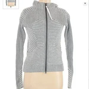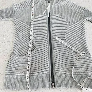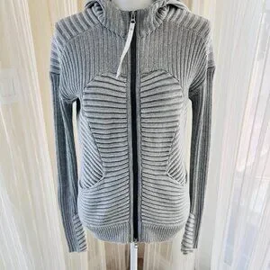 Beautiful gray Lululemon cable type sweater with interesting opposing panels throughout. Has a nice lined hoodie. Really thick nice zipper with enforcement. Two pockets up front. Has Lululemon zipper with logo and insignia. Has thumbholes at sleeve cuff.