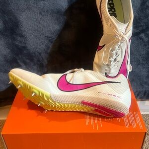 Elevate your performance with Nike's athletic spikes. Sleek white with bold pink details. Ideal for speed and agility.