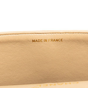 This shoulder bag features a quilted lambskin body, leather woven chain straps, double front flaps with interlocking Cs and a twist lock closure, an exterior back slip pocket, and interior zip and slip pockets. It carries a B+ condition rating.