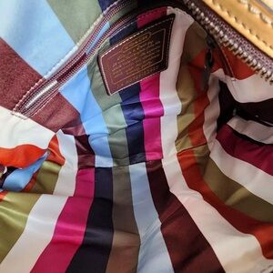 The classic bag features a zip and turn lock closure, making it secure and practical. A medium-sized bag with a width of 14 inches, a height of 11 inches, and a depth of 6 inches. It's made of high-quality luxurious leather and has a multi-colored fabric lining. The bag also comes with a key holder and is adorned with a buckle accent. This limited edition bag has a vintage look that will span any decade! Truly one of Coach’s best!