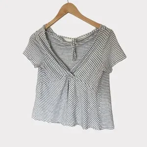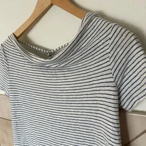 100% linen shirt in excellent pre owned condition. White with thin blue stripes, open back with a tie detail at the neck. Very cute and perfect for warmer weather!