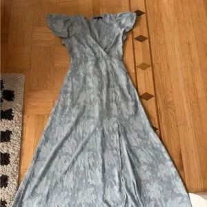 We can't help but love the Lulus Compelling Love Light Blue Jacquard Short Sleeve Maxi Dress! Lightweight woven jacquard, with a lovely floral pattern embossed throughout, shapes a surplice bodice that is framed by short fluttery sleeves. High waist, with a tying sash belt, flows to a midi hem with a side slit. Hidden back zipper/clasp.