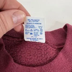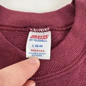 This Vintage 1980s Jerzees By Russell Crewneck Sweatshirt in Size Large is a classic piece from the USA with a nostalgic appeal. The maroon color and solid pattern add a touch of retro charm, while the crew neck and pullover style make it comfortable and easy to wear. Made from a cotton blend fabric, this sweatshirt features the iconic JERZEES logo as accents and is suitable for all seasons, making it a versatile addition to any wardrobe. Whether you're hitting the gym or simply looking for a cozy sweatshirt, this vintage piece offers a unique and timeless style.