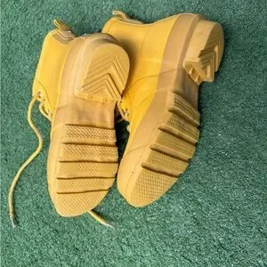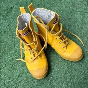 Vibrant yellow boots by Hunter. Features lace-up design. Stylish and practical.