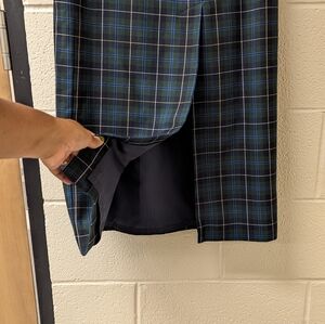 Blue and green plaid maxi skirt. Has belt loops and a front slit.