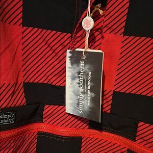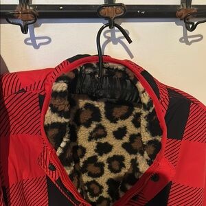 Stylish red and black plaid puffer jacket. Features a cozy design. Perfect for cold weather.