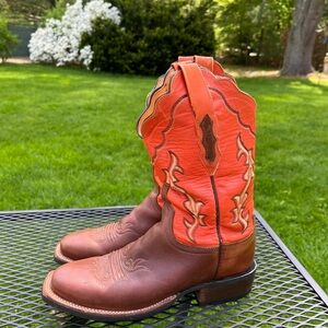 Stylish cowboy boots with antique brown leather and orange leather. Intricate stitching adds a classic touch. Lucchese model # T50006. Women’s Western KD Style Limited Release. Calf Leather. Made in the USA