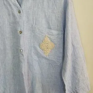 Soft Surroundings Linen Maxi Dress Blue White Striped Embroidered Side Slits S