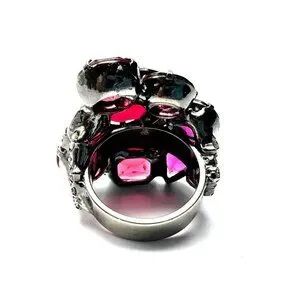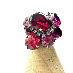 This jaw-dropping, highly collectible cocktail ring commands attention with explosive clusters of red and pink rhinestones. Attributed to Robert Sorrell from the prestigious Connie DeNave "JewelDiva" collection, this piece embodies the bold excess of 1980s statement jewelry. Sorrell Originals created one-of-a-kind costume jewelry for celebrities, Paris couture and Broadway productions. His artisans employed the finest crystals and rhinestones from Austria and the Czech Republic to create pieces with museum-quality construction.