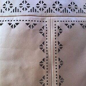 This stylish tank top from White House Black Market features a sleeveless design in brown.. The top is adorned with intricate geometric embroidery along the neckline and center front, adding a touch of elegance to its boxy silhouette. Crafted from a structured fabric, it maintains its shape beautifully, making it a versatile addition to any wardrobe. Leather and gently used 20 long, 32 bust