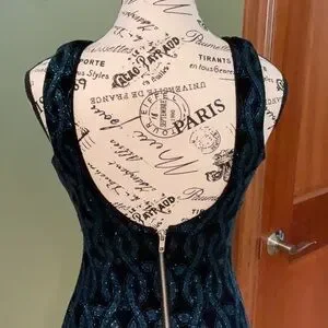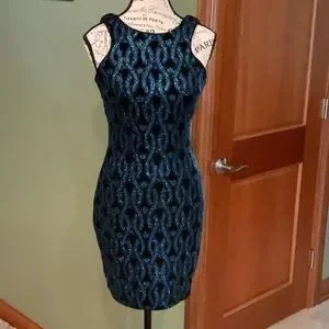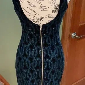 This chic mini dress by Speechless is perfect for a cocktail night out, featuring a sleek sheath silhouette and a stylish halter neckline. The sleeveless design showcases a striking black and blue color palette, making it a standout piece for any evening occasion. This dress is absolutely stunning! It zips in the back. The measurements are: bust 30 inches and the length is 33 inches from the top of the shoulder.