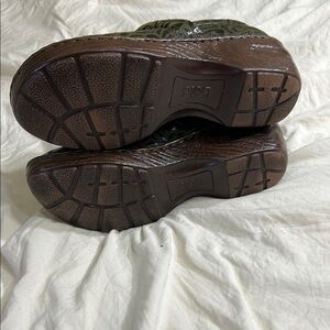 Step into comfort and style with these b.o.c. mules, featuring a unique embossed pattern in green. The slip-on design is complemented by a supportive brown platform sole, making them perfect for everyday wear.