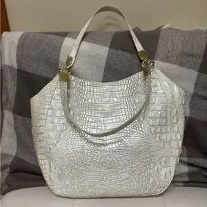 This elegant shoulder bag from Brahmin features a striking white crocodile-embossed texture, offering a sophisticated touch to any ensemble. Its structured design and glossy finish make it a versatile accessory for both everyday use and special occasions.