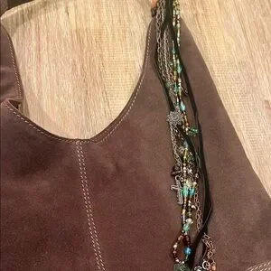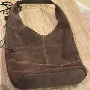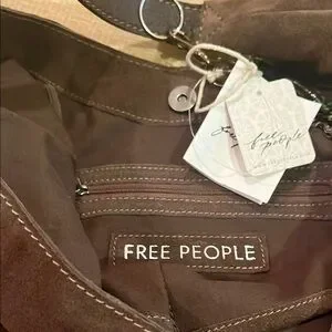 Stylish and versatile Free People brown suede bag, perfect for everyday use. Features a unique design with a comfortable strap for easy carrying. Interior pockets, 1 zipper 2 slid in. Brown leather handle. After market handbag charms added to complete the Boho style!