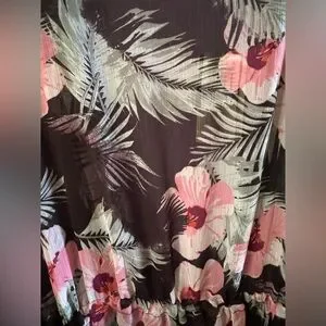 Elegant sheer cover-up with a stylish floral pattern. Features pink and white accents on a black background.