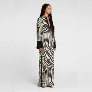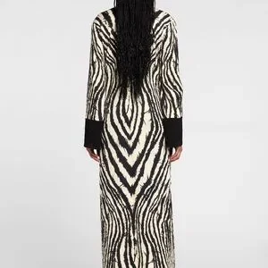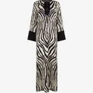 A brocade texture, painterly Freedom-print stripes and a floor-grazing shape: this dress captures Cavalli’s exotic design aesthetic. It's inspired by kaftan silhouettes, trimmed with solid black cuffs and embellished with a signature Tiger Tooth pendant at the neck. Brand NEW.retail price 4500$ Italian size 40