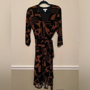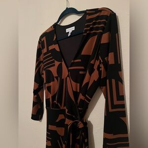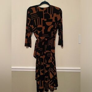 Stylish midi dress with geometric pattern. Features a flattering V-neck and three-quarter sleeves. Perfect for any occasion. Tub 2