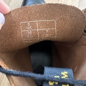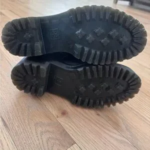 Crafted from durable black leather, these Dr. Martens combat boots feature a rugged rubber sole and classic lace-up design. Their sturdy construction and timeless style make them ideal for both work and casual wear.
