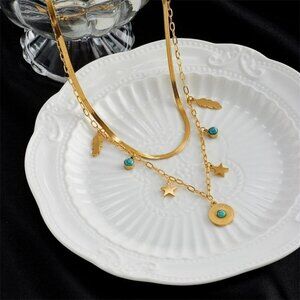 Fine Jewelry 2 Layer Leaves Star Cracked Stone Charm Chain Choker Necklaces
