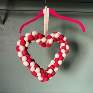 Charming heart-shaped wreath with red and white felt balls. Perfect for adding a touch of love to any space.