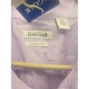 The Haggar Dress Shirt is a stylish and classic choice for men in size 18-18.5 with a 36/37 sleeve length. Made of comfortable cotton material, this solid purple shirt features a collared neckline, button closure, and accents. The shirt is designed for regular fit with lightweight, stretch, and wrinkle-resistant features, making it suitable for various occasions. Perfect for the modern man looking for a sophisticated yet comfortable dress shirt option.