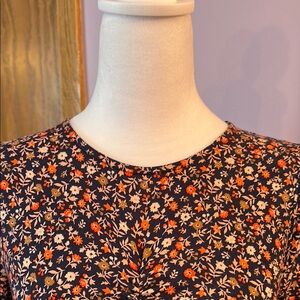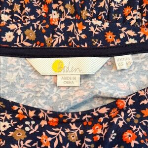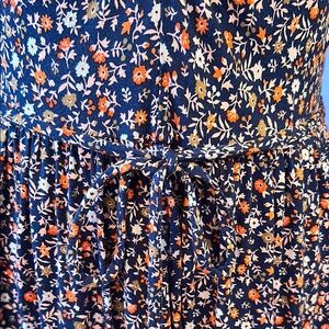 This elegant floral print dress features a beautiful blend of blue and orange, perfect for any occasion. The soft fabric and flattering fit make it a must-have addition to your wardrobe. It’s has a removable tie at the waste and two side pockets.