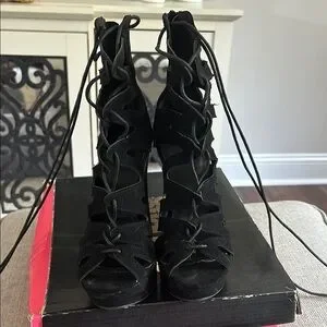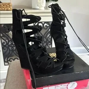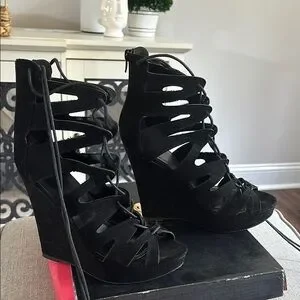 Step out in style with these chic black lace-up wedge sandals. Perfect for any occasion, they offer both comfort and elegance.