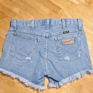 Classic Wrangler shorts in light blue denim. Features signature stitching and branded patches.