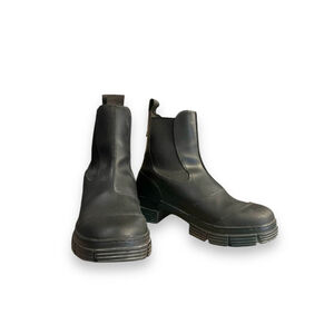 Statement Ganni black rubber Grip Chelsea boots in size EU 37 / US 6.5. Durable rubber exterior with elastic side gussets, chunky traction sole, and minimalist Scandinavian design. Water-resistant, easy to pull on, and perfect for fall and winter wear.