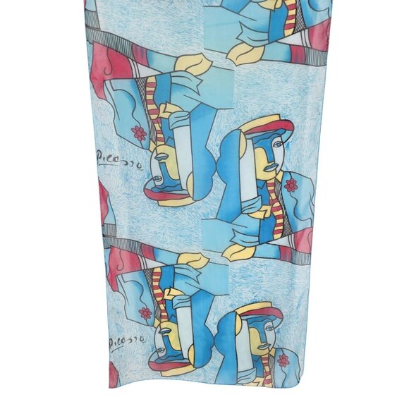 Lightweight sheer rectangular Picasso themed scarf - wrap - shawl - shades of blue, pink, yellow & white with an abstract man / person art pattern. Picasso spelled out around the scarf.