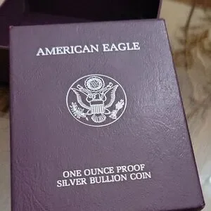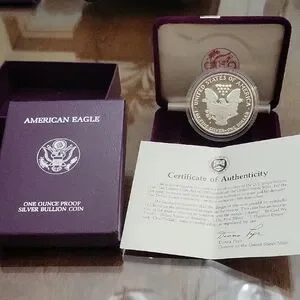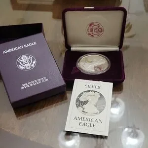 American Eagle silver bullion coin in a velvet case. Includes original box and certificate.