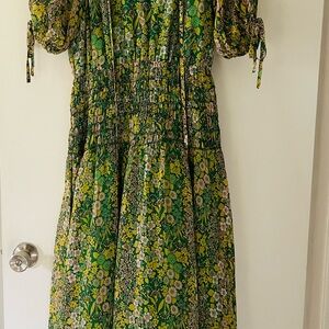 Step into elegance with this Ted Baker sundress, featuring a vibrant green hue adorned with delicate white floral prints. Designed with short puff sleeves and a classic crew neck, this midi dress is perfect for wedding guest occasions. Its airy fabric and flattering silhouette ensure comfort and style for any cocktail event.