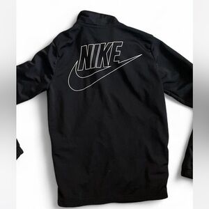 Stylish black tracksuit set by Nike. Features iconic logo on jacket and pants.