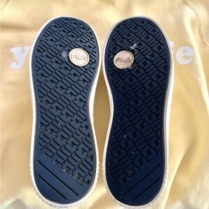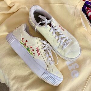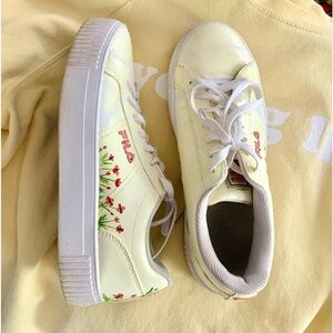 Custom painted floral yellow and pink Fila sneakers, women’s US size 8.5/9