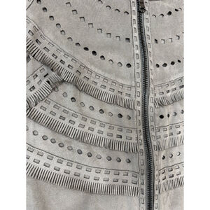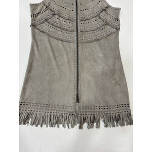 This is a pre-loved ost brand long sleeveless zipper front vest . The vest is made of a gray faux suede material. It has decorative cutouts and fringe detailing. The vest has a straight silhouette. The zipper functions smoothly. It is lightweight and soft. Styles include, boho, western, buisness casual, rodeo and concert. Bundle and save!
