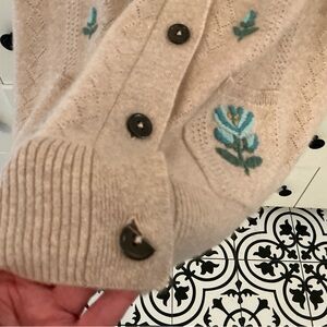 This elegant cardigan from Bloomingdale's features a classic V-neck design in a soft beige hue, adorned with delicate green botanical motifs. Crafted from a medium-weight knit, it offers a timeless silhouette perfect for layering and adding a touch of sophistication to any ensemble. NWOT. Never worn but the bottom button is broken.
