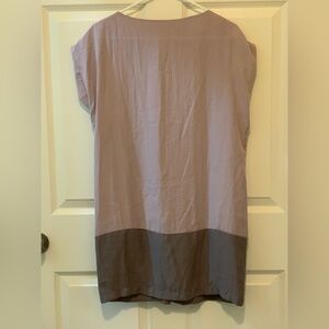 Stylish sleeveless dress with a two-tone design. Features a light purple top and gray bottom.
