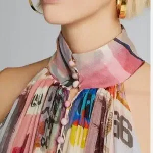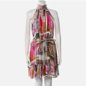 This stunning Zimmermann mini dress features a sleeveless, halter neckline and a playful ruffled, tiered design. The vibrant red and pink hues make it perfect for resort wear or cocktail events, while the airy fabric ensures comfort and style in warm weather.