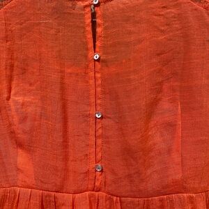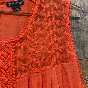 Brighten your wardrobe with this vibrant orange sleeveless top. Featuring intricate lace detailing, it's perfect for any occasion. Lace embellished cool orange summer top. Armpit to armpit 25”. Length 31”