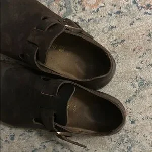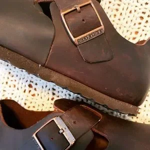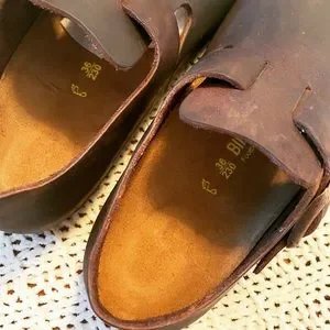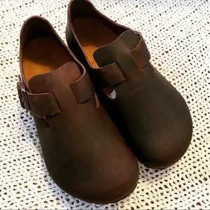 Classic Birkenstock mules. Rich brown leather. Comfortable and stylish. Clogs
