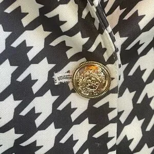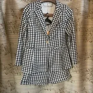 Elevate your wardrobe with this chic black and white houndstooth blazer. This jacket offers a timeless style and a flattering fit, including shoulder pads and a gold-look front closure. Pairing with the matching and included shorts adds a playful and flirty element.