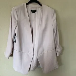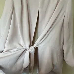 Blazer is a size large and is fully lined and has opening in the back and ties bow in the back. Sleeves are 3/4 and are scrunched a bit. Material is 100%polyester.