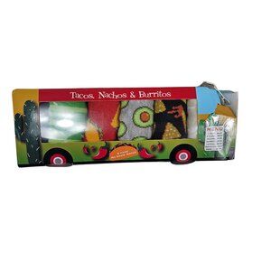 Spice up your sock drawer with this fun "Tacos. Nachos & Burritos" themed 6-pack of no show socks! Packaged in a unique food truck-shaped box, these novelty socks feature a variety of vibrant food-related graphics, including avocados, chili peppers, and taco/burrito designs. Crafted from a comfortable blend of 98% polyester and 2% spandex, they fit sock size 10-13 (shoe size 6 1/2 - 12). Perfect for adding a playful touch to your everyday attire or as a unique gift!