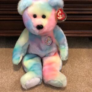 Ty Rare Birthday Beanie Buddy. He was made in 2000, he is rainbow colored. He is 14 inches long.He is the first beanie baby without a birthday and he is a birthday buddy. He is super rare. He has a tag cover over his tag.